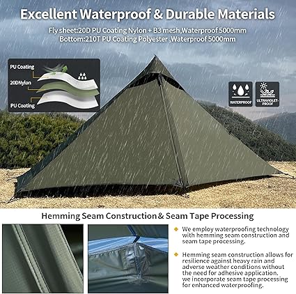 - 【Material and Performance】: The flysheet is made of 20D nylon with B3 mesh, the bottom is made of 210T PU-coated polyester, both providing 5000mm waterproofing.The tent is lightweight yet strong, standing solid as a rock in windstorms, hail, and thunderstorms. It is also UV-resistant and tear-resistant.