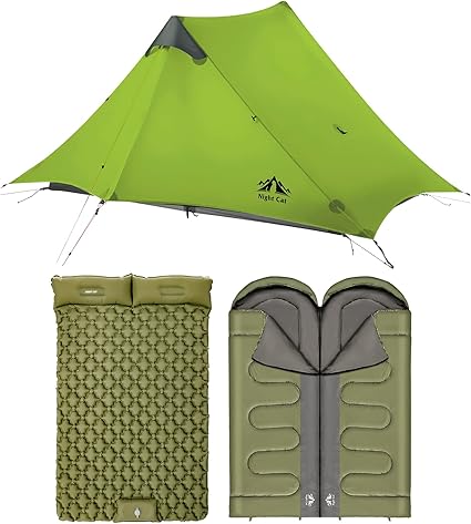 - 【What it Contains】The set includes 1 pcs Night Cat Ultralight Tent, 1 pcs Night Cat Inflatable Double Sleeping Pad,and 1 pcs Night Cat Double Sleeping Bag