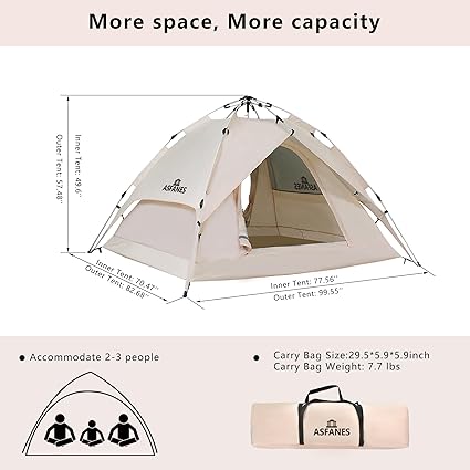- 2 IN 1 TENT:ASFANES 2 person automatic camping tent is composed of a detachable outer tent and an inner tent. The whole camping tent is windproof and rainproof . Remove the inner tent and it can be used as a sunshade. Lets you enjoy sunbathing during the day and stargazing at night, giving you a romantic journey