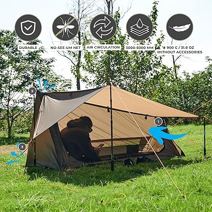 - Ultralight Bivy Tent: Our tactical tent is crafted from ultralight 1.1oz silnylon with a 3000mm waterproof rating and a robust 40D nylon bottom floor with a 5000mm waterproof rating, ensuring exceptional rain protection. Enhanced with no-see-um mesh boasting 1600 holes per square inch, it guarantees an insect-free environment for a peaceful night’s sleep.