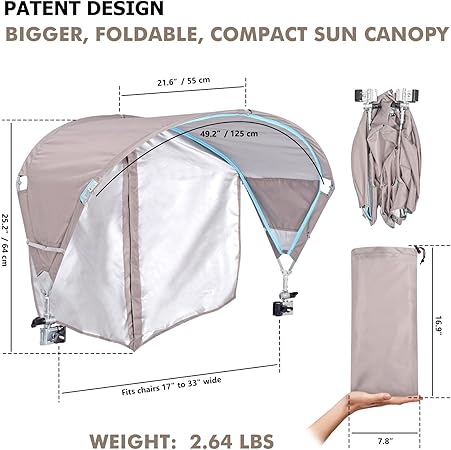 - 【Universal Compatibility】The adjustable universal clamp make this chair umbrella easily adapts to various chairs, including beach /camping /lawn /zero gravity/ lounge /tanning chair, and even beach wagon. Accommodating widths between 17” and 33”.The ultimate accessory for any outdoor setting!