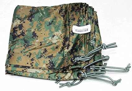 Product is exactly as I hoped. Official USMC issued Tarpaulin, lightweight, ripstop, with double sided snaps and heavy duty grommets. I purchased mine used in good condition which meant that it was clean but had a small 1/4″ hole, presumably from a smoker or being too near a fire. I repaired it with clear tape on both sides and is like new. Resists mildew and is fairly durable. Great for burrito wrapping your gear, as a ground cloth, or as a sun shade or any shelter really. I use a bivy sack, taco wrapped in this product for an extra layer.