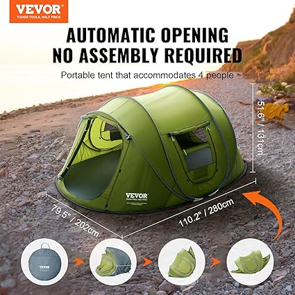 - Enjoy Camping Again: Easily set up your pop-up camping tent by simply unpacking it and letting it assemble itself in seconds. No need for complicated instructions that waste precious camping time. The camping tent is spacious, measuring 110.2″ x 79.5″ x 51.6″, and can comfortably accommodate 3-4 adults with sleeping bags or 2-3 people with plenty of luggage. It is the perfect choice for camping.