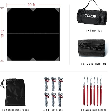Included Components | 1 x Carry Bag, 6 x Aluminum Stakes, 1 x Accessorles Pouch, 6 x 11.5Ft Lines, 1 x 10’*10′ Rain tarp |