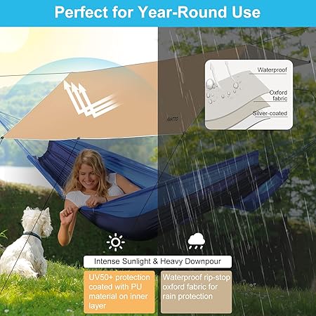 - ✅ Waterproof and UV Protection: The hammock rain fly features water pressure resistance up to 3000mm to maintain great performance ever during extreme weathers. The leak-proof taped seams also prevent water penetration. It’s not only a sustainable rain shield that can completely protect you from rain, but also a reliable sunshade with inner silver layer for UV protection.