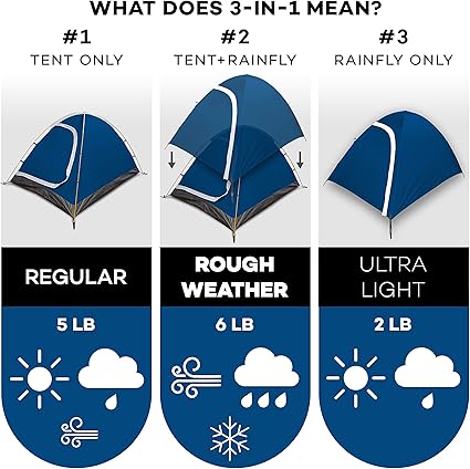 - ⚡⚡⚡ Today’s Special – get it for $69.50 – normally $118 ✅ UNIQUE 3-IN-1 TENT – Every time you go hiking, you’ll get 3 configuration options to choose from: “Regular”, “Rough Weather” or “Ultralight”. Choose the set-up that best fits your needs on your next camping trip. Thanks to these options, the Revalcamp 3-in-1 tent is the most versatile tent on the market.