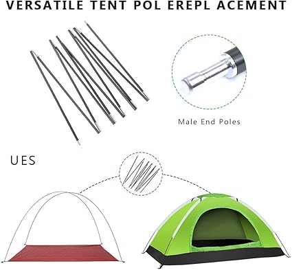 - 【ASSEMBLED POLE SET】Designed for your easy usage to fit your tent, it’s assembled, save your energy and time to install, open directly to replace whole fiberglass or aluminum tent pole. In the meanwhile, you can follow the left picture guideline to adapt to the female end connector