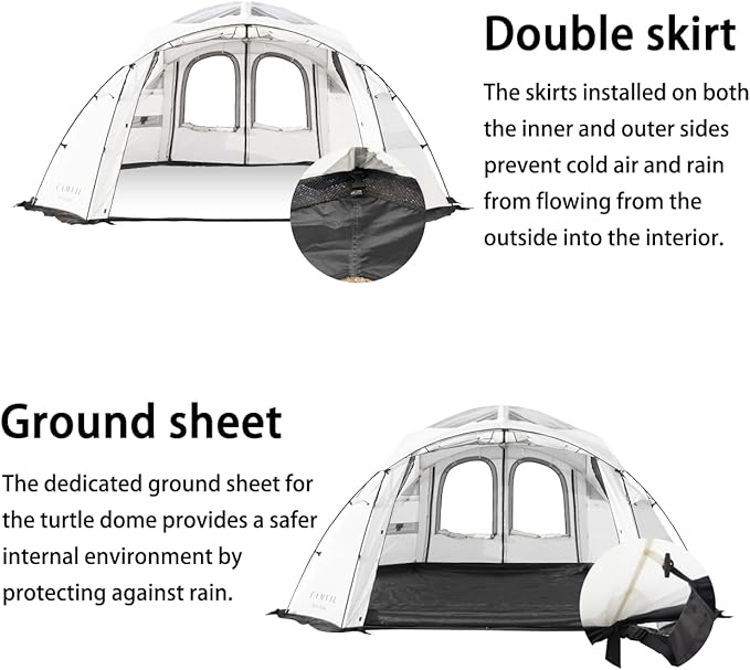 - 【Domed Tent Design】The CAMVIL Turtle Camping Tent is a fortress-style tent with panoramic skylights. Made from 70D nylon with high-tech seam taping, it boasts a waterproof rating of up to PU3000mm.The doors, windows, and skylights feature a double-layer design, offering 360° perfect ventilation and exceptional views while keeping you protected from insects.
