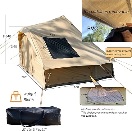 - 【DIMENSION: 】height-9.84ft(300cm), floor-16ft x 15ft(490*460cm), door-6.5ft x 6.5ft(200x200cm). It’s high enough to make you stand upright and walk around in this cabin tent.