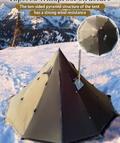- Weatherproof :70D Nylon Grid Fabric,3000mm Waterproof Rating;The shape of the peaked roof and the positive decagonal base design gives the tent a low center of gravity and therefore extreme wind resistance