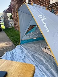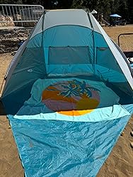 I bought this for a trip to the beach with family and am very pleased with it! I set this up in my yard, just to see what it’s like so I’d be prepared when on the beach. Very quick setup and the directions were great. Between then and when we went to the beach, I lost the stakes lol… so I found 2 larger stakes in my camping gear and brought those with us. When we got to the beach, we found it was VERY windy. I’m glad we had at least the 2 stakes, but that would not be enough! Thankfully, the tent has 4 pouches on the corners that you can fill with sand! These really helped keep the tent from blowing away. We also had our beach bags inside to help hold it down, but that wasn’t necessary. This really made our beach experience comfortable… without it, I’m sure we all would have been burnt to a crisp and sandblasted (the wind was blowing the sand). We spent time going back and forth between the ocean and the tent. It has a nice little flap on it that extends outwards, but I put a beach mat on top of that to make the area bigger for the kids and their towels, toys, seashells, and whatnot. Inside the tent was most comfortable for 2 adults… but you could fit probably 4 people inside if you didn’t have all the bags and coolers in there, too. It was bigger than most tents we saw on the beach that day.
