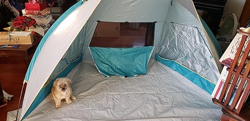 Facile da montare, usato per fare ombra in vacanza con aereo,la confezione sta comodo magente in valigia e si sta dentro sdraiati in due comodamente,ovvio che copre fino a metà persona…..consigliato se uno non può portarsi dietro l’ombrellone