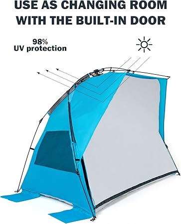 - EASY TO USE : this beach tent is easy to Setting up and fold carry. folded size of 37.4″ L x 6.7″ W x 6.7″ H. Weighing 8 lbs, it can be carried by one hand or on your shoulders, and easily loaded into the trunk of the car.
