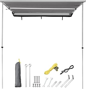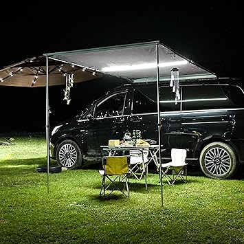 - [Easy Installation & Storage]: Features telescoping poles with twist-lock design, allowing for fast setup by simply mounting the brackets on the car roof, stretching out the awning, extending the poles and adjusting to your desired height; Its retractable design allows for easy disassembly and storage in the trunk; Built-in slot on the front-end bar for securing additional side awning fabric or awning room easily