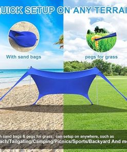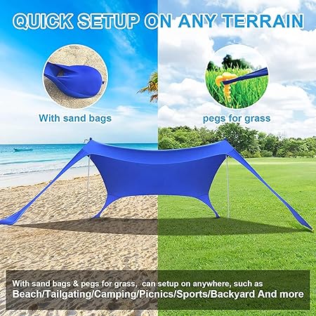 - 【Easy Installation Steps】- 1. Lay the canopy on the ground – extend it as far as possible and pull out as many empty sandbags as possible to form an X shape. 2. Fill the sandbag to the brim, stuffing in more sand (or whatever is convenient for your location) while pulling the bag taut. The sand spikes are then screwed through the sandbag into the sand. 3. Insert the rod under the sand and insert the top rounded end into the lycra material that creates the desired shade.